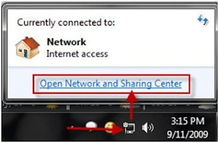 2. kemudian navigasikan ke bagian pojok kanan taskbar lakukan klik kanan icon Network, pilihlah “OpenNetwork & Sharing Center“. Dan lakukan hal sama pada laptop lainnya.